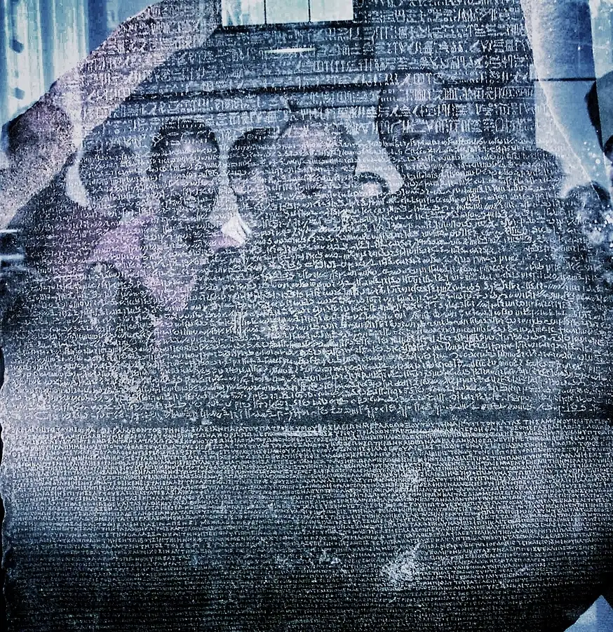This is the Rosetta Stone which was translated by Champollion in Paris in 1822. It is in three languages. This was the key to unlocking the meaning of hieroglyphs. Written in 196 BC, the bottom part is in ancient Greek, which was understood, the top Egyptian hieroglyph (unknown) the middle in demotic script. It was rediscovered by the French in 1799, and as they were defeated by the Brits in 1801, it was brought back to London. It weighs 1700 lbs. That's me in the middle of the picture.