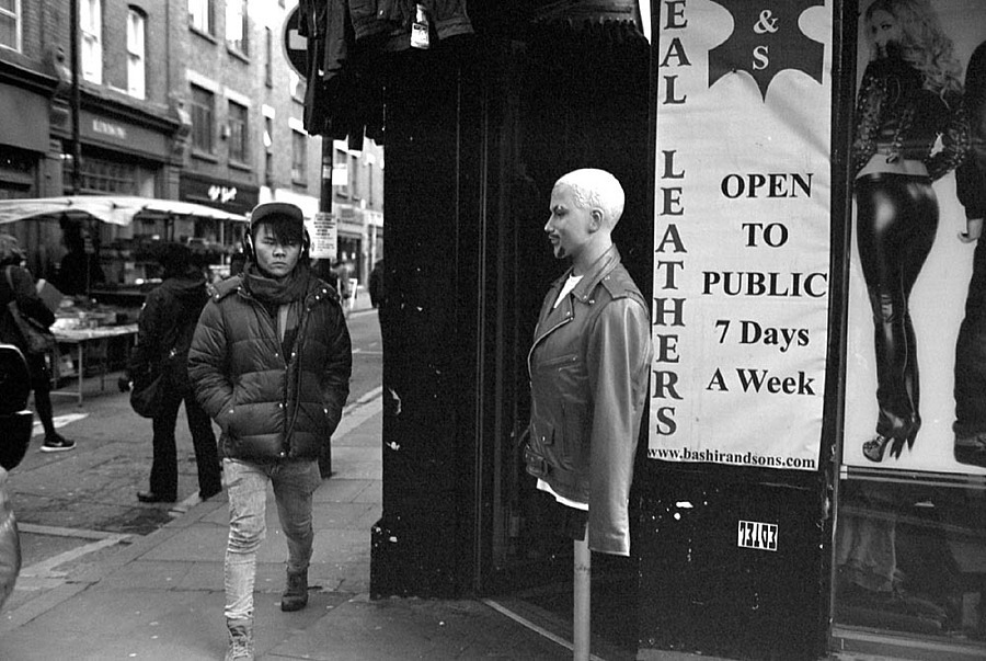 First visit to Brick Lane, London -- lots of other photographers there ! I had only outdated Agfa Scala 200 rated 100 ASA to use up but got some good results at f2.8 or even f1.4 -- I processed the film in home-made ID11 1+1 for 12 mins at 20oC