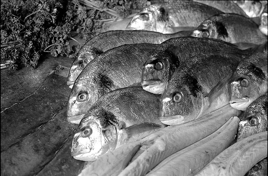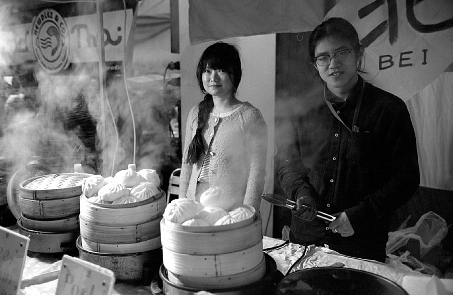 Taken at our Friday market -- I didn't use a small enough aperture to get the best depth of field. 2007 outdated Fuji Acros 100 processed in home-made ID 11 formula 1+1