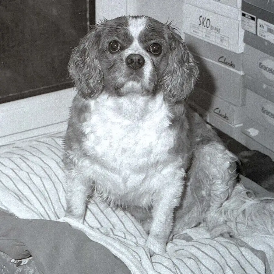 My Sister-in-Law's dog MIKKI III we had for two weeks -- my boy was 'in charge' luckily-- pic shows Mikki after a walk where we all got caught in heavy RAIN so he is drying out near our front door - I had three frames to finish up in my 1962 ROLLEIFLEX 2.8F Planar so took them with my Metz 45CL3 flash at f11 -- this is my MOST VIEWED EVER Photo on FLICKR with 2,680 'views' and it's only a SNAP of a DOG not even with bounced flash !! I bet it doesn't get ANY Views or Comments on this site !