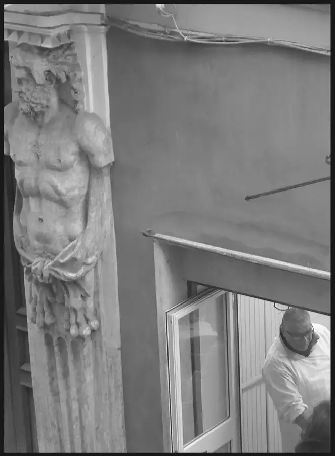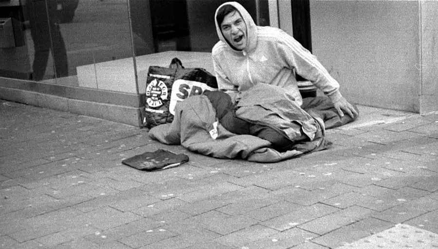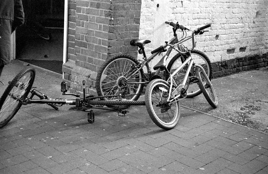 Taken at waist level as I passed -- focus and framing guessed , I wanted to use up some 1996 outdated Kodak P3200 film which I processed in home-made Microphen 1+1 for 9 mins @ 20oC . Grainy but OK for Computer viewing !