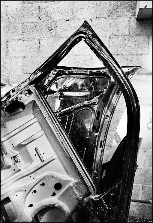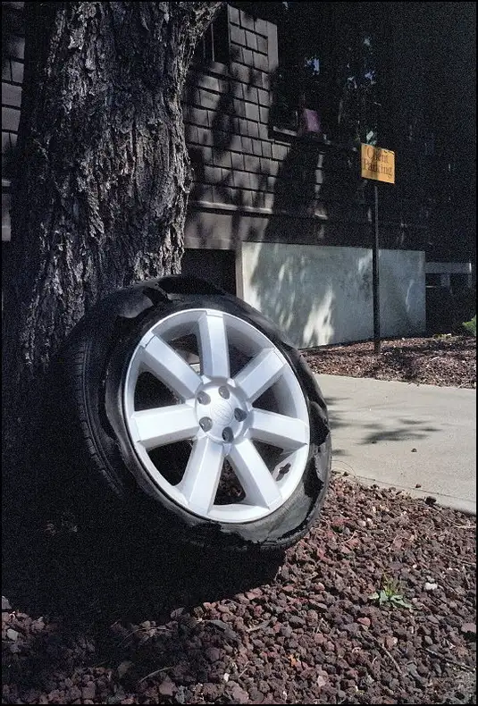 In the client parking for this lawyer's office, the shredded tire struck me as ironic.