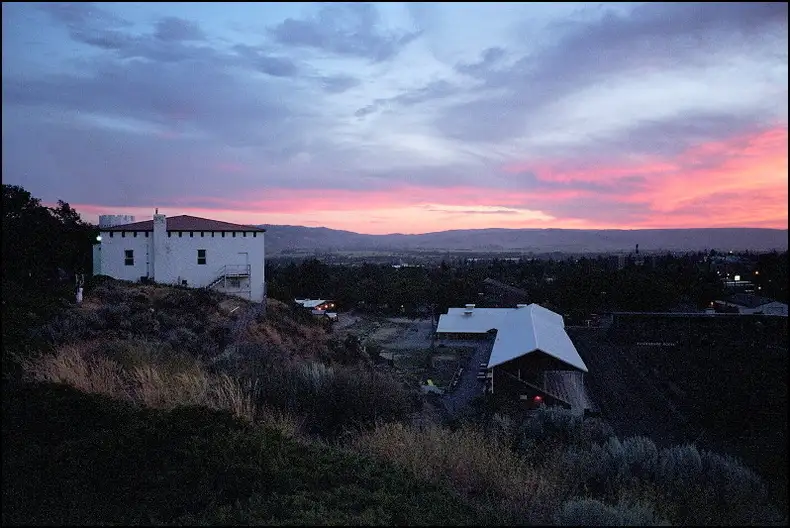 American Legion building at left on the hill overlooking the rodeo arena to the right below, county fairgrounds to the left. Eastern Washington