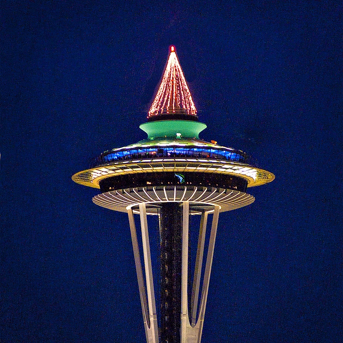 The Space Needle in Seattle, Washington, decked out for the season.