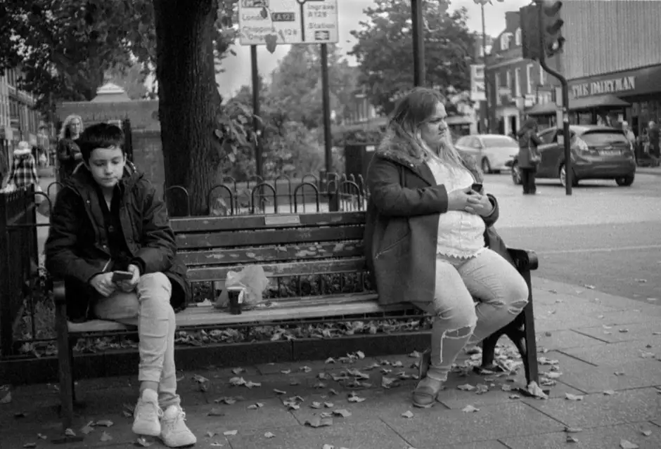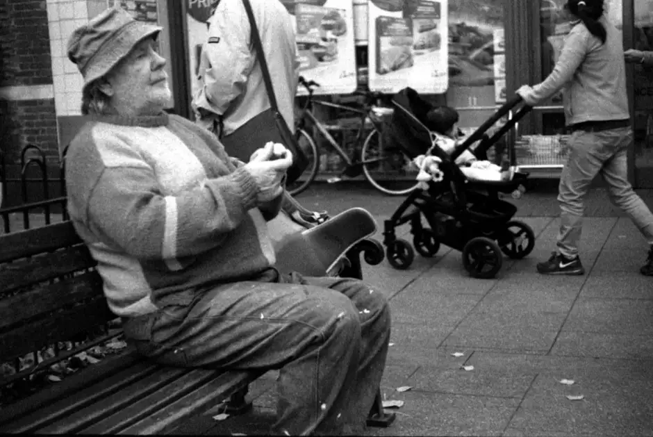 Taken at waist level as I passed -- focus and framing guessed , I wanted to use up some 1996 outdated Kodak P3200 film which I processed in home-made Microphen 1+1 for 9 mins @ 20oC . Grainy but OK for Computer viewing !