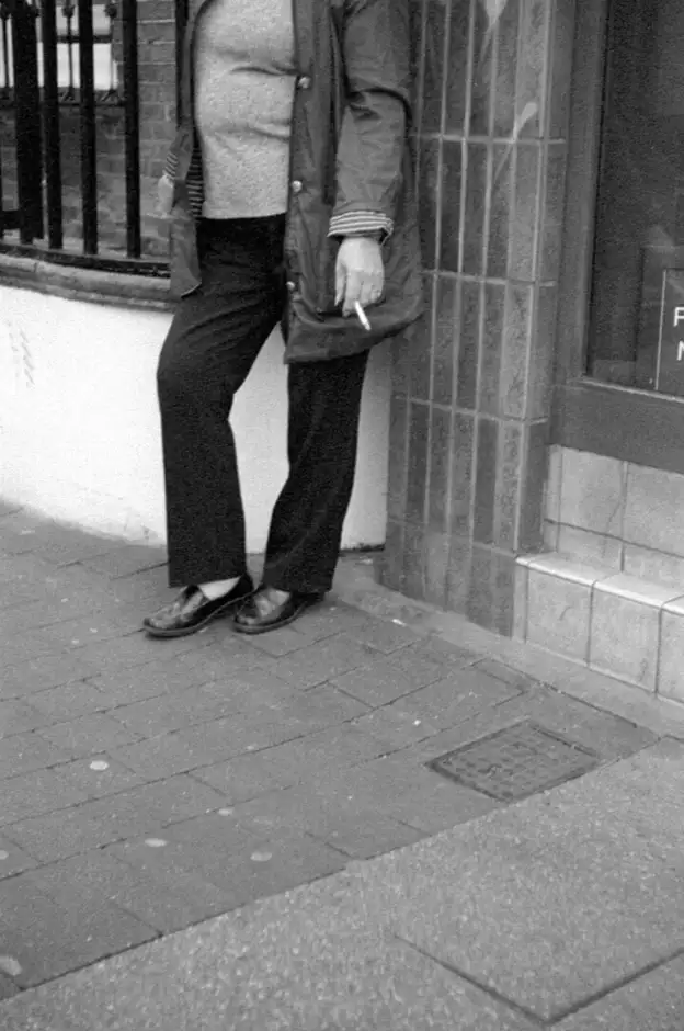 Taken at waist level as I passed -- focus and framing guessed , I wanted to use up some 1996 outdated Kodak P3200 film which I processed in home-made Microphen 1+1 for 9 mins @ 20oC . Grainy but OK for Computer viewing ! I cut her HEAD OFF but it is 'ARTY' and would sell for lots of $$$ or the newly-devalued £££ in a Gallery I bet !