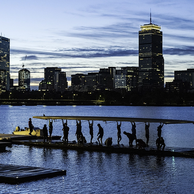 The Boston skyline frames rowers from the Massachusetts Institute of Technology crew team shortly before today's sunrise.