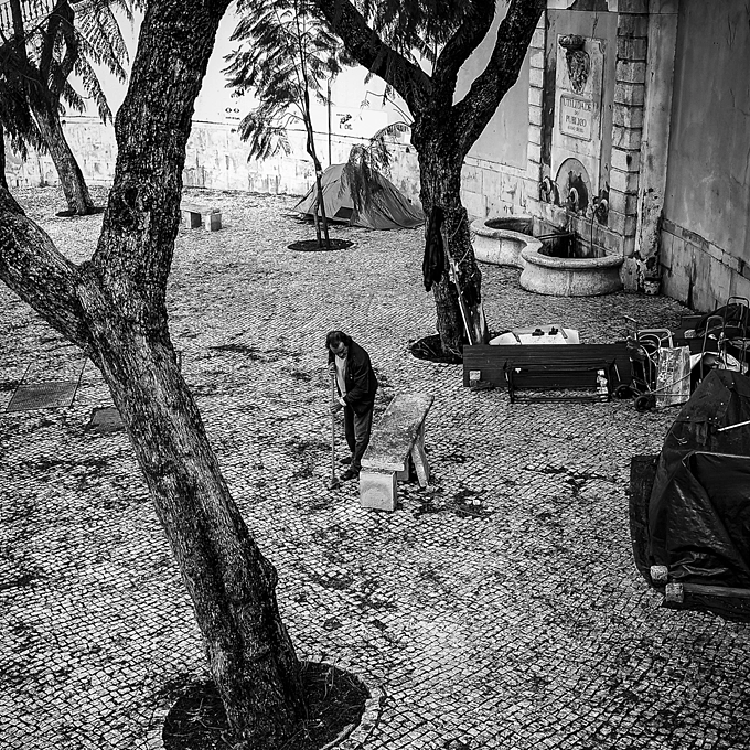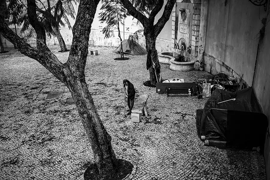 Homes build around a city fountain, a man sweeps the area. City of Lisbon Portugal