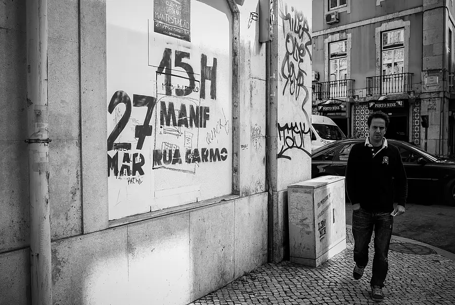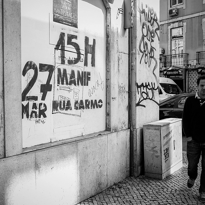 Graffiti in downtown Lisbon Portugal. Political messages such as this one for one of the many demonstrations, can be seen painted and sprayed onto walls all over Lisbon.