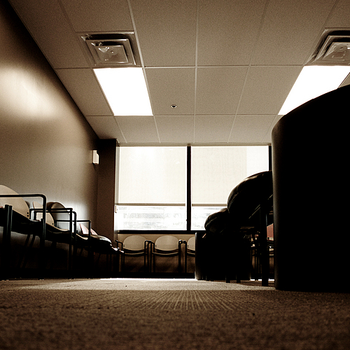 (Jerseyville, IL) Barber Jimi Hill cuts the hair of Alex Weaver at 11:15 AM on the Monday morning following Alex's high school graduation. Jimi previously worked in the shop of Elmer Heafner which is located two blocks away. Jimi is only the third barber in the location since the early 1930's. The leather covered seating and art deco fixtures date from that period. His shop is lit by plate glass windows and a door facing east with some fluorescent lamps above the stations and the ceiling.