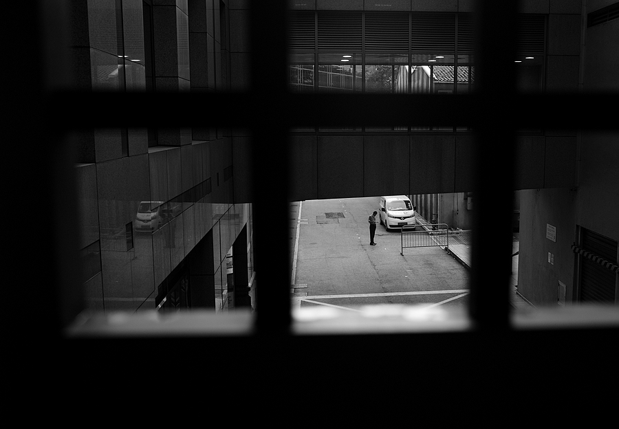 A side street seen through a carpark window