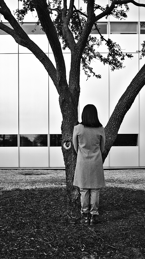 Person and Live Oak in front of The Modern