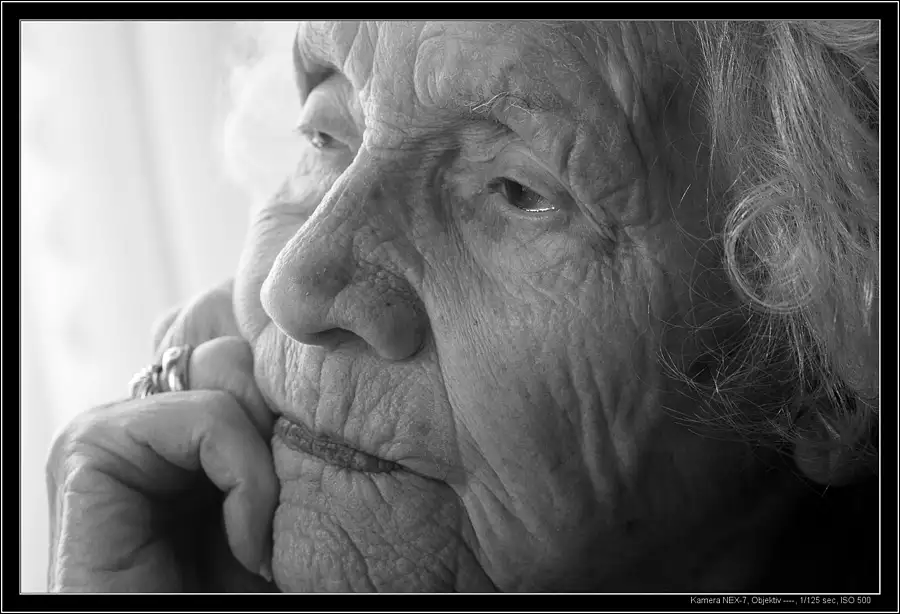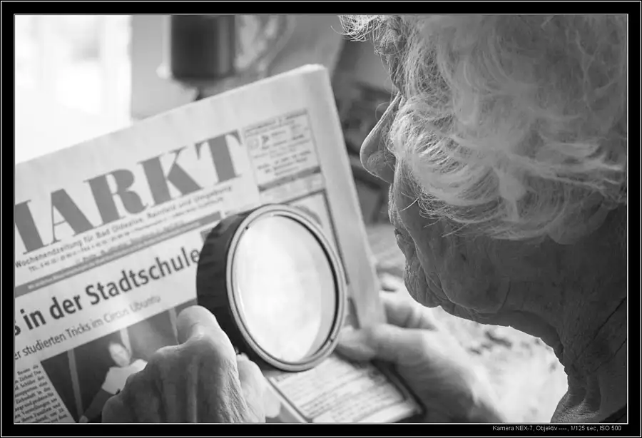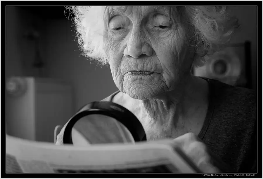 my mother in law, born 1923, trying to read the large letters (with Macula Degeneration)