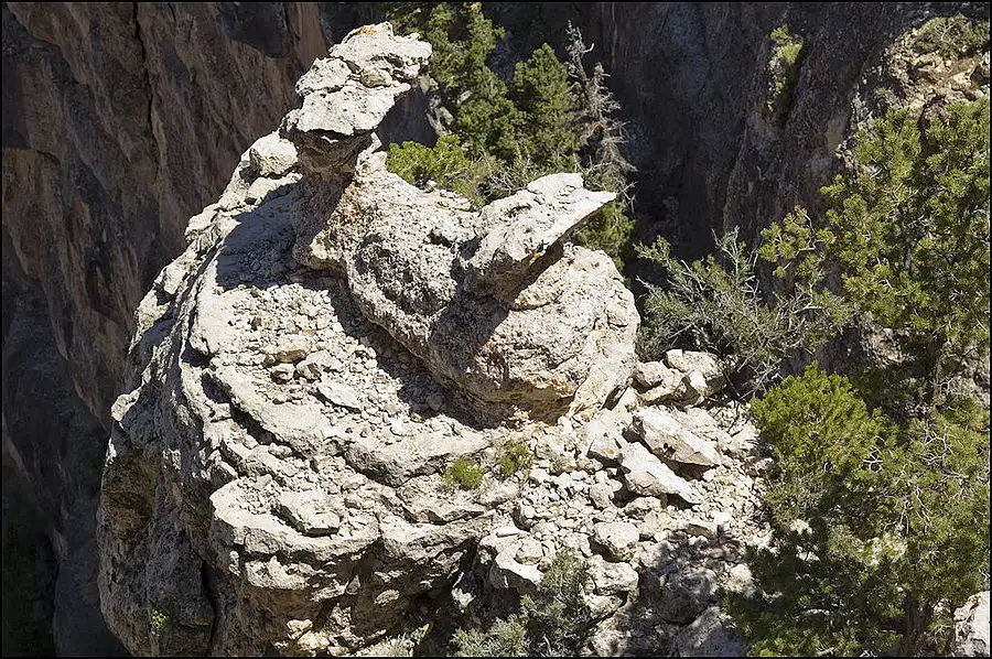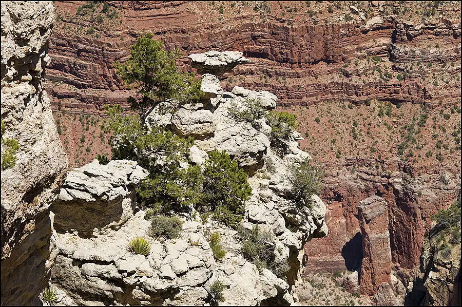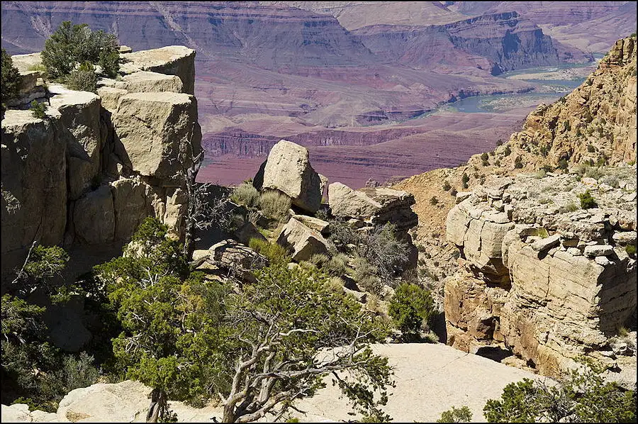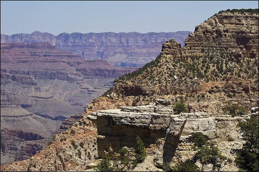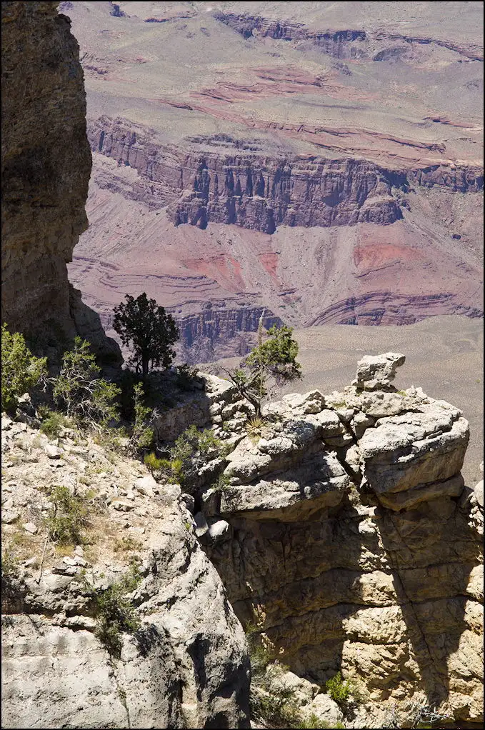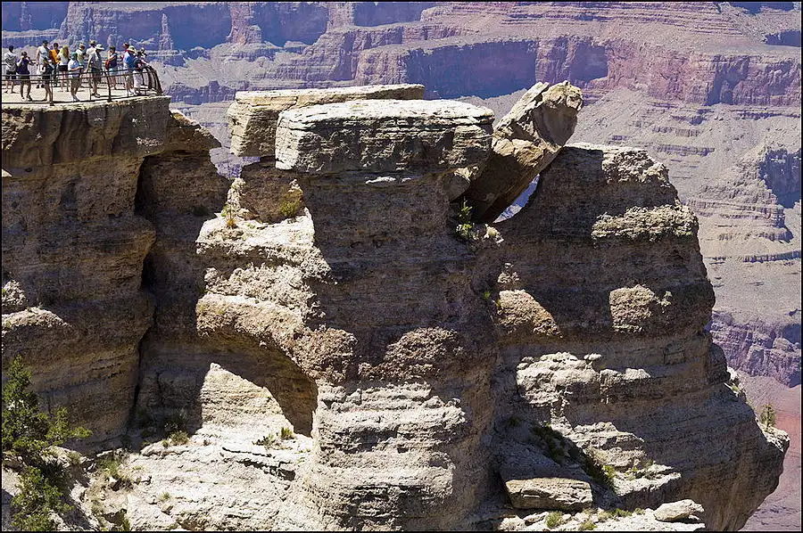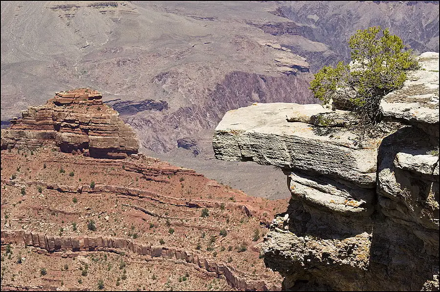 You may be able to make out a trail from above center at the right edge, running to the left to the tilted rock beyond the leftmost point of the light color outcropping. There are people on that trail and at the tilted rock. A lower switchback is visible too. Grand Canyon.