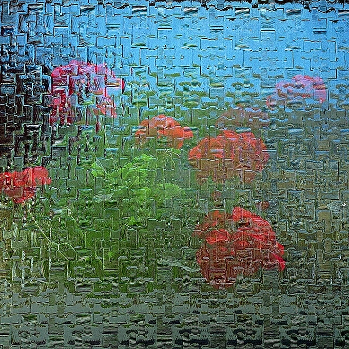 a Double Exposure in my house -- our glass front door and my wife's Geraniums in the back garden ! I used up some 1999 Kodak GPF film I had been given and home-processed in C41.