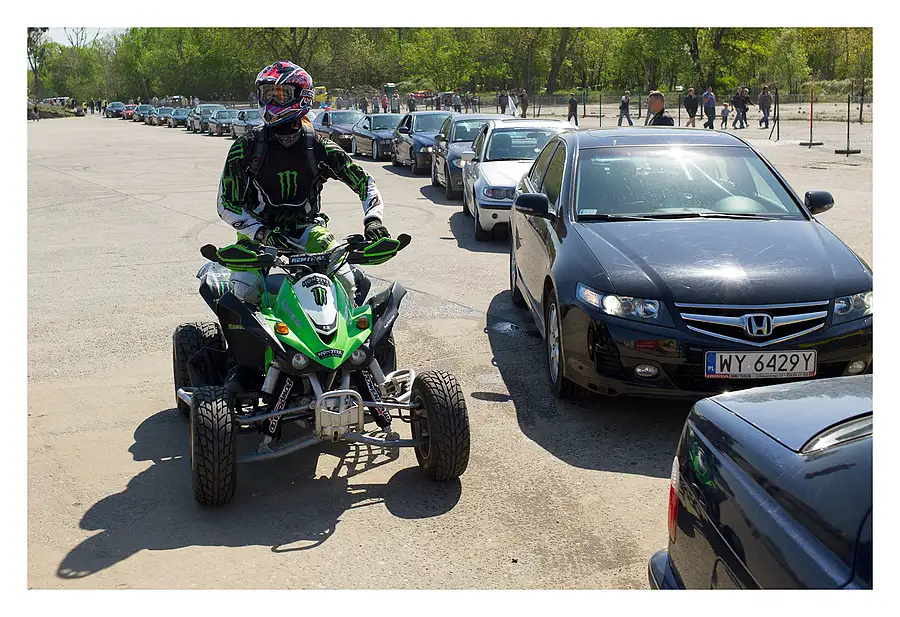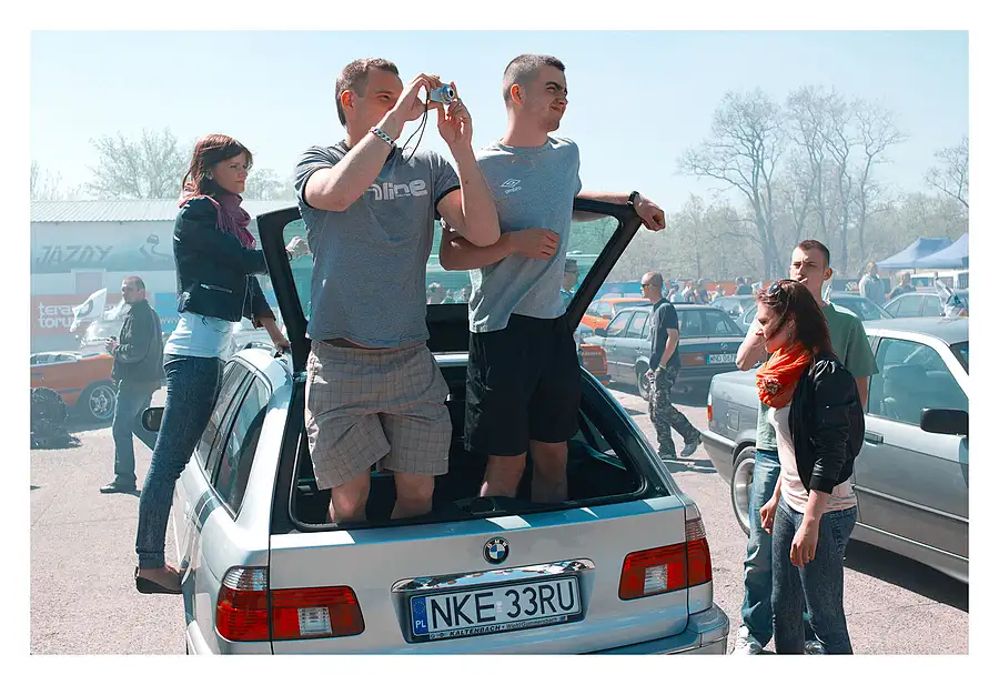 Every year a BMW car rally is held in Torun. The event is massively popular and attracts many local people and visitors from other parts of Poland. These guys were watching a tyre burning contest and stood inside the trunk of their car to gain a height advantage.