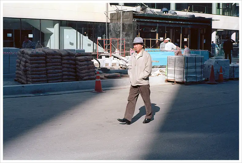 The shape of building's structure resembles the man's hat