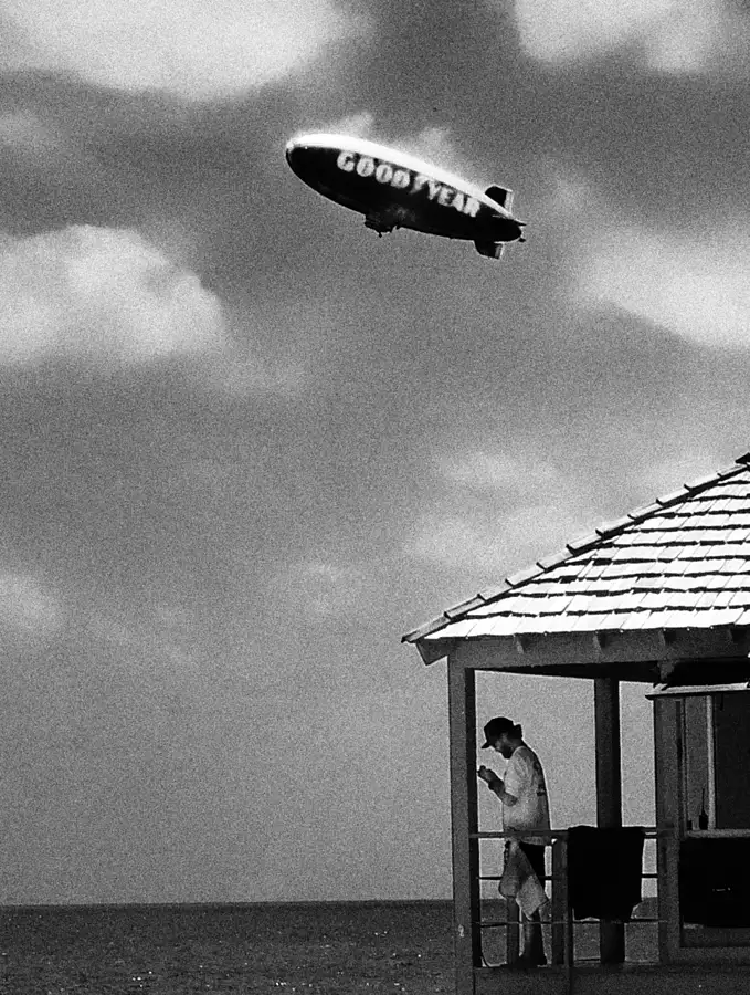 This was taken today at Deerfield Beach, Fl. I had finished shooting for the day and was walking back to the beach house when the blimp caught my eye. Luckily I still had the camera in my hand - Digilux 1. A few seconds too late and the blimp would have cleared the building. I took some follow up shots but none of them was as good. Strangely the life guard was not noticed consciously, but my subconcious knew.