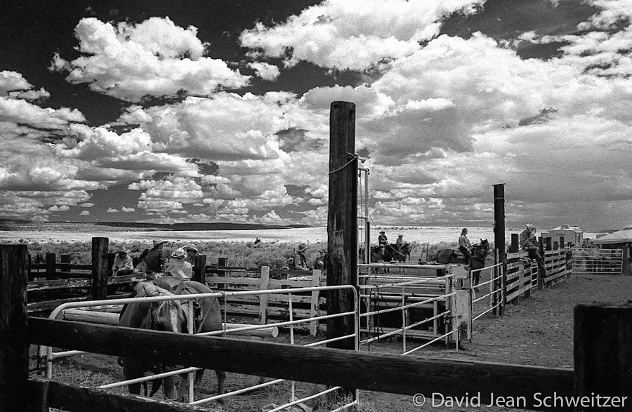Cowboy lights a cigarette between rodeo slacks - infrared film - Galisteo, New Mexico