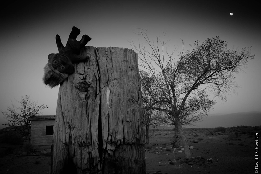 Doll nailed to a post in front of a deserted desert house - Las Lunas, NM
